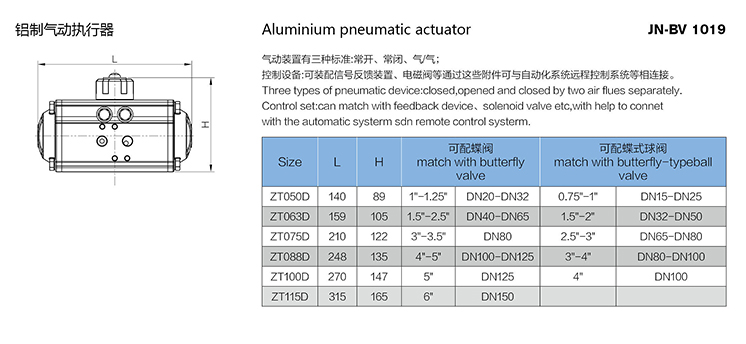 The pneumatic butterfly valve is controlled with aluminum piston by the compressed air. The piston controls the valve disc to work with 90degree so the valve open or close. The pneumatic actuator can be dis-assembly and maintenance. The torque of the pneumatic actuator is big , it is easy to install and operate.
