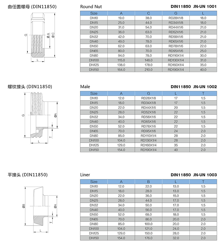 Standard: DIN, SMS, ISO, 3A, BPE, IDF, AS, BS,RJT