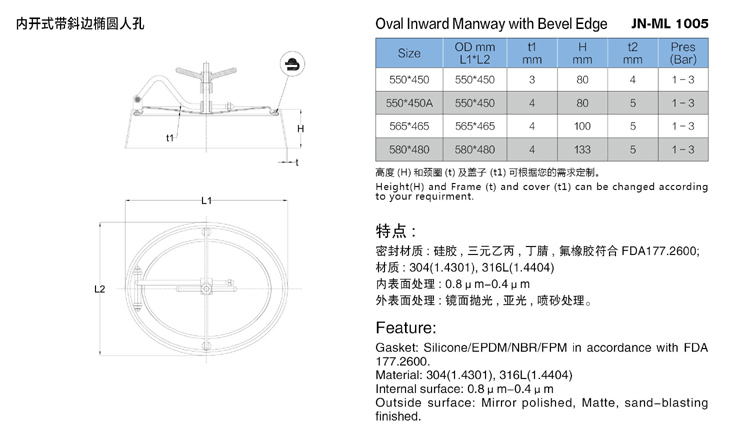 Stainless Steel Sanitary Oval Inward Manway With Bevel Edge